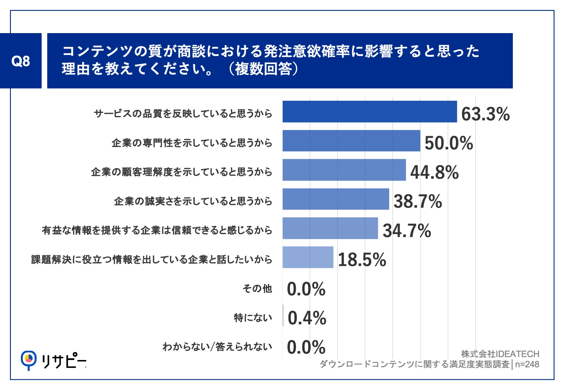 コンテンツの質が商談における発注意欲に影響すると思った理由としては、「サービスの品質を反映していると思うから」が63.3%で最も多く、以下「企業の専門性を示していると思うから」「企業の顧客理解度を示していると思うから」と続いた。
