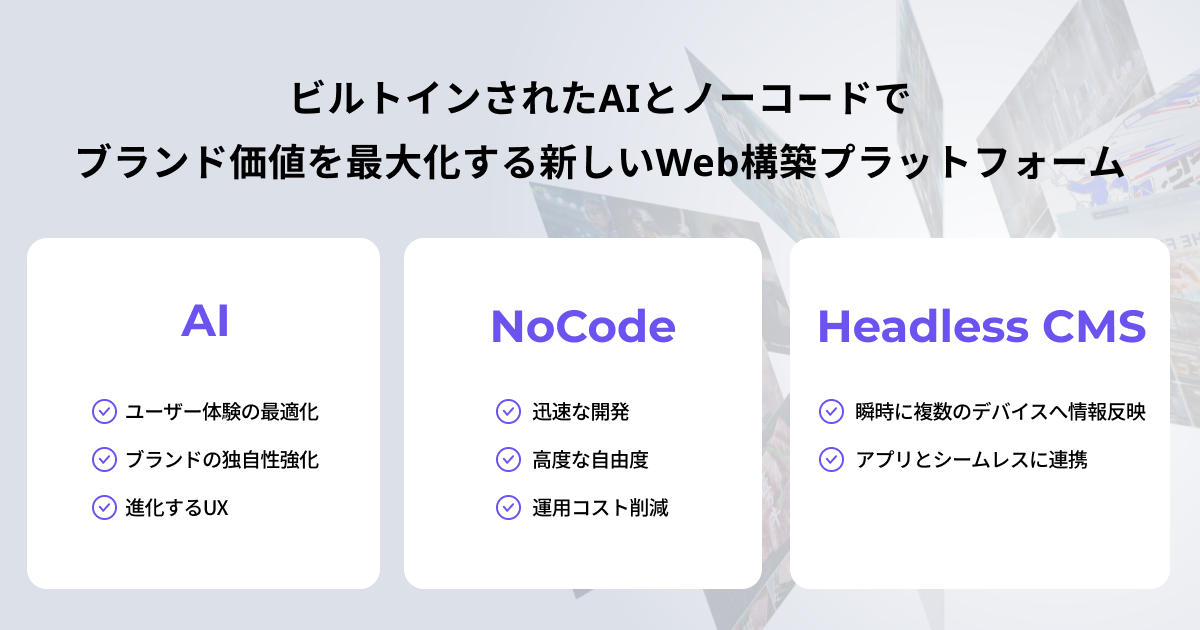 企業のデジタルコミュニケーションではアプリの活用に加えてウェブとの連携が重要で、両方を統合した運用の仕組みが求められていることから、アプリで培ったノーコード技術と運用支援のノウハウをウェブ分野に広げた。作成したいページの内容を入力するとAI機能がページを自動で生成。閲覧機器に応じて表示させるレスポンシブにも自動対応する。