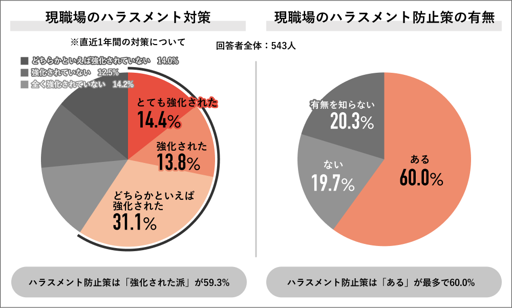 パーソルキャリアが運営する調査機関「Job総研」は、「2025年 ハラスメント実態調査 ~被害・職場対策編~」の結果を発表した。直近1年のハラスメント意識や勤務先での対策の変化などについて、社会人男女543人が回答している。