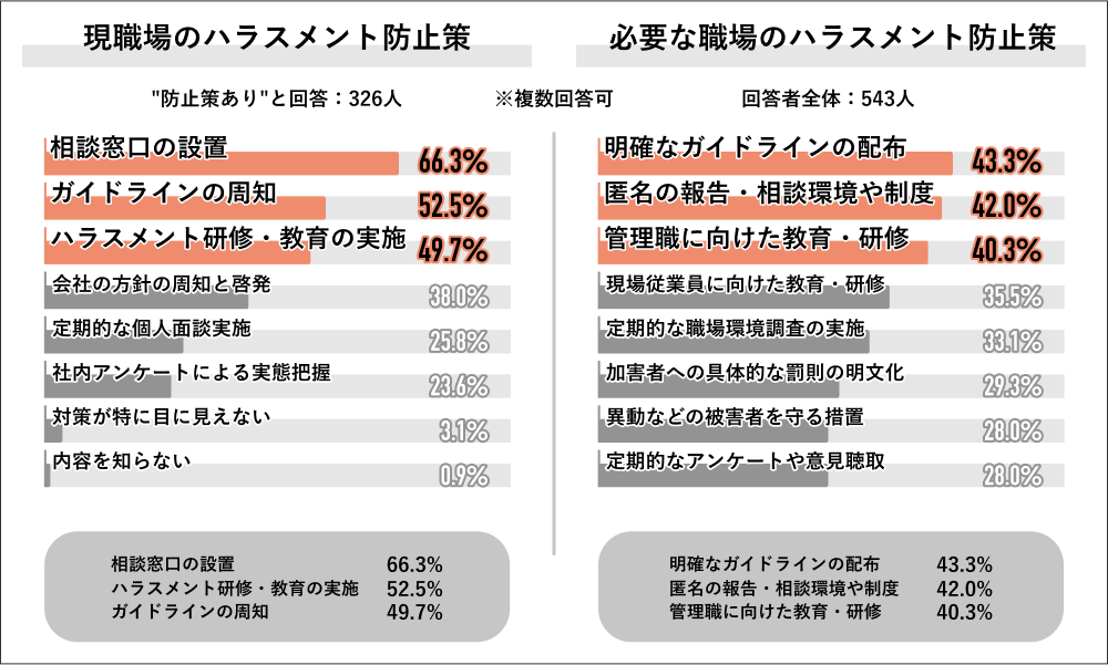 「具体的な対策内容」を聞くと、「相談窓口の設置」66.3%が最多で、「ガイドラインの周知」52.5%、「ハラスメント研修・教育の実施」49.7%がそれに続いた。一方で「職場のハラスメント防止に必要な対策」を聞くと、「明確なガイドラインの配布」43.3%が最多、「匿名の報告・相談環境や制度」42.0%、「管理職に向けた教育・研修」40.3%が上位で、微妙なズレが見られる。