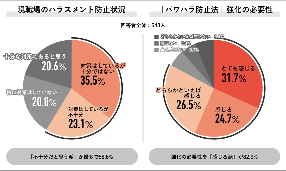 そのためか、現職場のハラスメント防止対策への印象については、過半数が不十分だと考えているようだ。「パワハラ防止法強化の必要性を感じるか」を聞くと、「必要性を感じる派」82.9%で大多数を占めている。