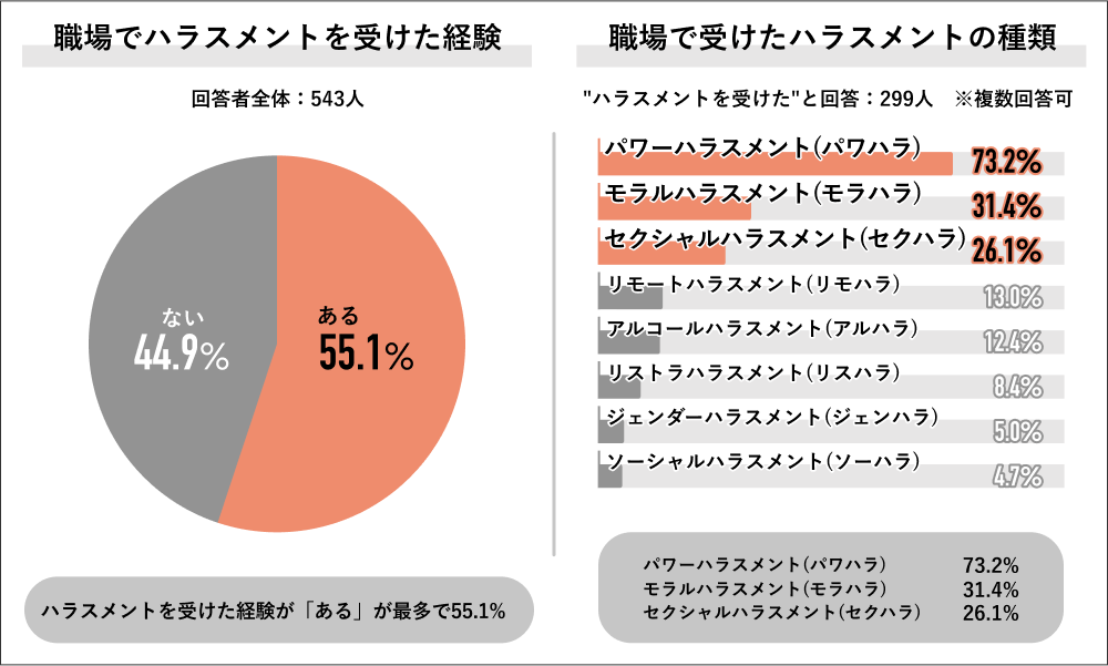 実際「職場でハラスメントを受けた経験」を聞くと、「ある」55.1%が過半数を占める。その内容では、「パワーハラスメント(パワハラ)」73.2%が圧倒的に多く、「モラルハラスメント(モラハラ)」31.4%、「セクシュアルハラスメント(セクハラ)」26.1%がそれに続く。
