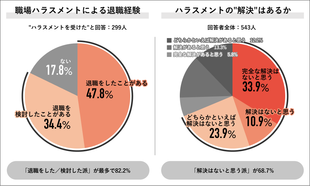職場ハラスメントに対して「退職を検討した経験があるか」を聞くと、「ある派」が82.2%で大多数。また「ハラスメントが解決されることはあるか」においても、「解決はないと思う派」が68.7%と多数を占めた。