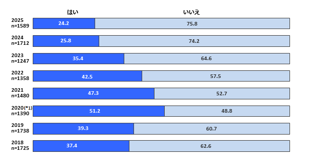 大学の入学前に新入生同士でSNSなどで連絡をとりあった経験があるかという質問では、2025年度は24.2%が「はい」と回答。2020~2022年のコロナ禍をピークに減少を続けており、オンラインからリアルのコミュニケーションへの回帰がうかがえた。