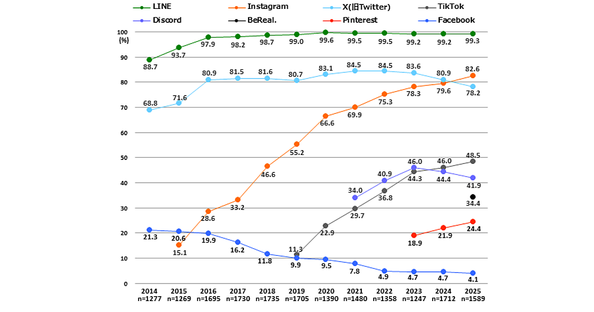 東京工科大学は、新⼊⽣の「コミュニケーションツール」利⽤実態調査を実施した。2025年度の新入生1,589人を対象にSNSの利用実態を聞いている。なお、本調査は2014年から実施しており、今回で12回目となる。