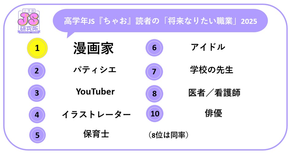 小学館のJS研究所は、女子小学生(JS)を対象に「夢」に関する調査を行い、結果を発表した。少女まんが誌「ちゃお」2025年4月号のハガキアンケートに対し、将来なりたい職業などについて読者1,000人が回答している。
