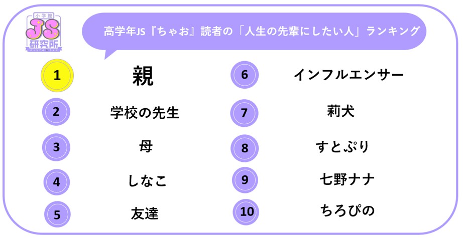 「この人みたいになりたいと思う、人生の先輩にしたい人」では、1位「親」で、僅差で2位「学校の先生」、3位「母」が続いた。一方、4位にはインフルエンサーの「しなこ」がランクイン。歌手、モデル、YouTuberとしても活躍する原宿系動画を多数バズらせている。他のインフルエンサー・YouTuberでは「莉犬」、彼が所属する「すとぷり」も上位だった。