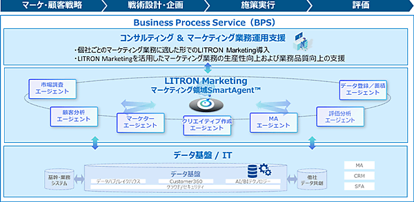 NTTデータは、AI(人工知能)を活用してマーケティング業務の生産性を向上させるAIエージェントサービス「LITRON Marketing(リトロンマーケティング)」を6月から提供を始めると5月19日に発表した。マーケティングの戦略・戦術(施策)の企画から実行、評価に至るまでAIエージェントが一気通貫で自律的に支援・代行する。マーケティング業務の負荷を最大6割削減することを見込んでいる。
