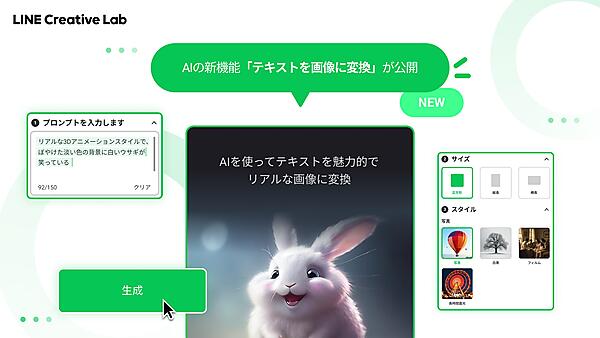LINEヤフーは、ビジネス用クリエイティブツール「LINE Creative Lab」でテキストの入力内容から画像を生成する機能「テキストを画像に変換」の提供を始めたと5月19日に発表した。広告主が思い描いたイメージをテキストで入力すると、AI(人工知能)がその内容をもとに画像を自動生成する。画像生成時にサイズとスタイルを設定できるので、広告の用途に合わせてイメージに近い画像を生成できる。