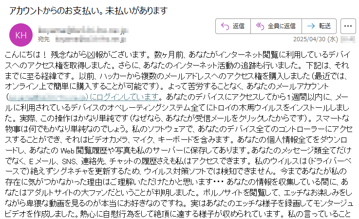 「セクストーション詐欺」とは、「あなたのPC・スマホをハッキングで遠隔操作し、あなたが性的な動画を楽しんでいる様子をWebカメラで撮影し履歴も保存した。公開されたくなければ身代金を支払え」などと主張し、金銭やビットコインでの振り込みを要求する詐欺だ。実際にはまったく遠隔操作などされておらず、無差別にメールをばらまいているだけだが、あわてて要求に応じてしまうユーザーも多い。