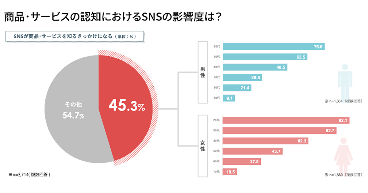 SNSが商品・サービスを知るきっかけになるかを聞くと、全体では45.3%が「はい」と回答。特に20代女性では92.1%、30代女性では82.7%にのぼっており、購買行動に与える影響の大きさがうかがえた。