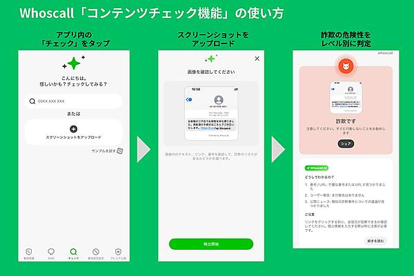 電話・ネット詐欺対策アプリを展開するWhoscallは、インターネット広告やメッセージのスクリーンショットから詐欺リスクを判別する新機能「コンテンツチェック機能」の提供を始めたと5月20日に発表した。SNSやWebブラウザに表示される広告、メッセージアプリ、SMSなどのスクリーンショットを撮影してアプリにアップロードするだけで、AI(人工知能)が詐欺かどうかを瞬時に判定し、簡単に詐欺リスクをチェックできる。