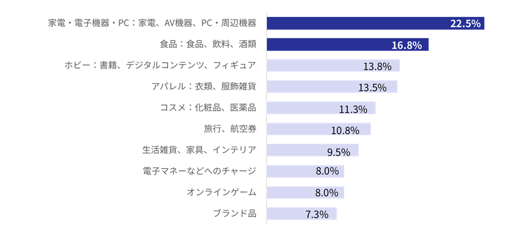 まず、クレジットカード不正利用により購入された商品の内訳を見ると、最も多かったのは「家電・電子機器・パソコン」(22.5%)で、ついで「食品・飲料・酒類」(16.8%)となった。家電や高級嗜好品など、高額で換金性が高いものが対象となっている。