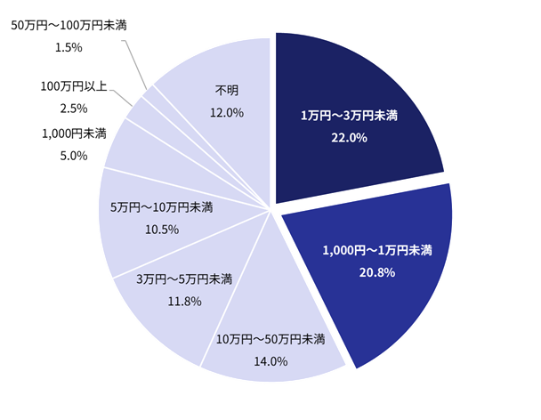また、不正利用による被害額を聞くと、「1万円~3万円未満」が22.0%、「1,000円~1万円未満」が20.8%となり、3万円未満の被害が全体の42.8%を占めた。
