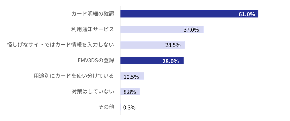クレジットカードの不正利用対策としては、「カード明細の確認」が61.0%で最多となり、「利用通知サービスの登録」が37.0%、「EMV3-Dセキュアの登録」が28.5%と続いた。なお、40代以降のEMV3-Dセキュア登録率は、年齢とともに低下する傾向が見られた。