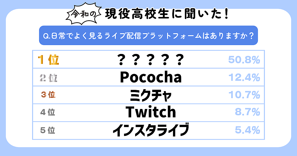 高校生がよく見ているライブ配信プラットフォームの1位は「TikTok LIVE(50.8%)」。他のプラットフォームに比べ圧倒的に母数が多く、有名芸能人やアイドルの貴重なコラボ配信などが話題を呼んでいる。2位は「Pococha(12.4%)」、3位は「ミクチャ(10.7%)」と続き、どちらも10代のユーザーに人気のアプリだ。5位はInstagramで見られる「インスタライブ(5.4%)」がランクインした。