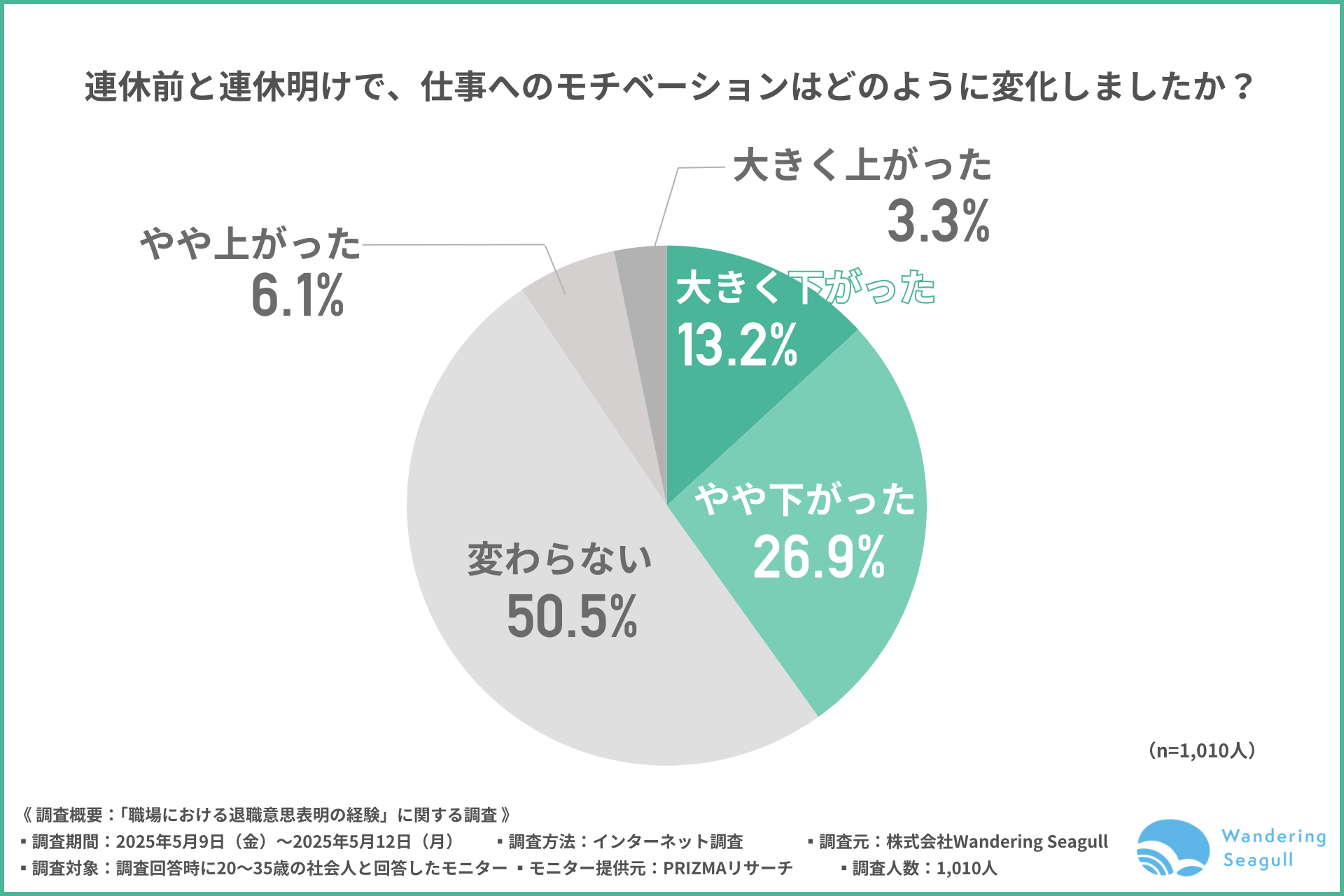 連休前と連休明けでの仕事へのモチベーションの変化としては、「変わらない」が半数を占めた一方で、大きく下がった・やや下がったの合計は40.1%にのぼった。