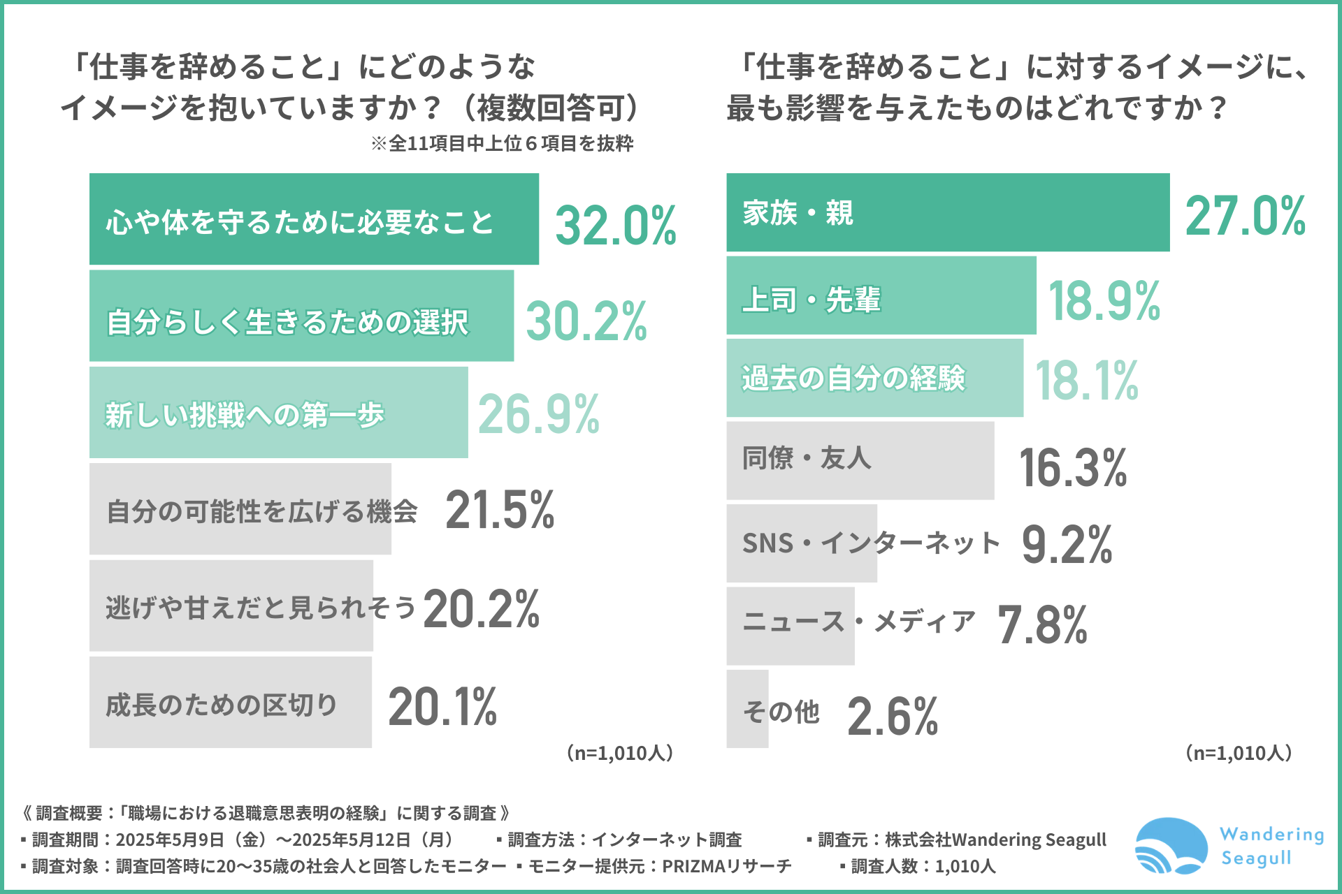 仕事を辞めることに対するイメージを聞くと、「心や体を守るために必要なこと」が32.0%で最も多い結果に。「自分らしく生きるための選択」「新しい挑戦への第一歩」も上位となり、前向きな印象が強いようだった。また、そうしたイメージの形成に影響を与えた要素としては、「家族・親」が27.0%で最多だった。