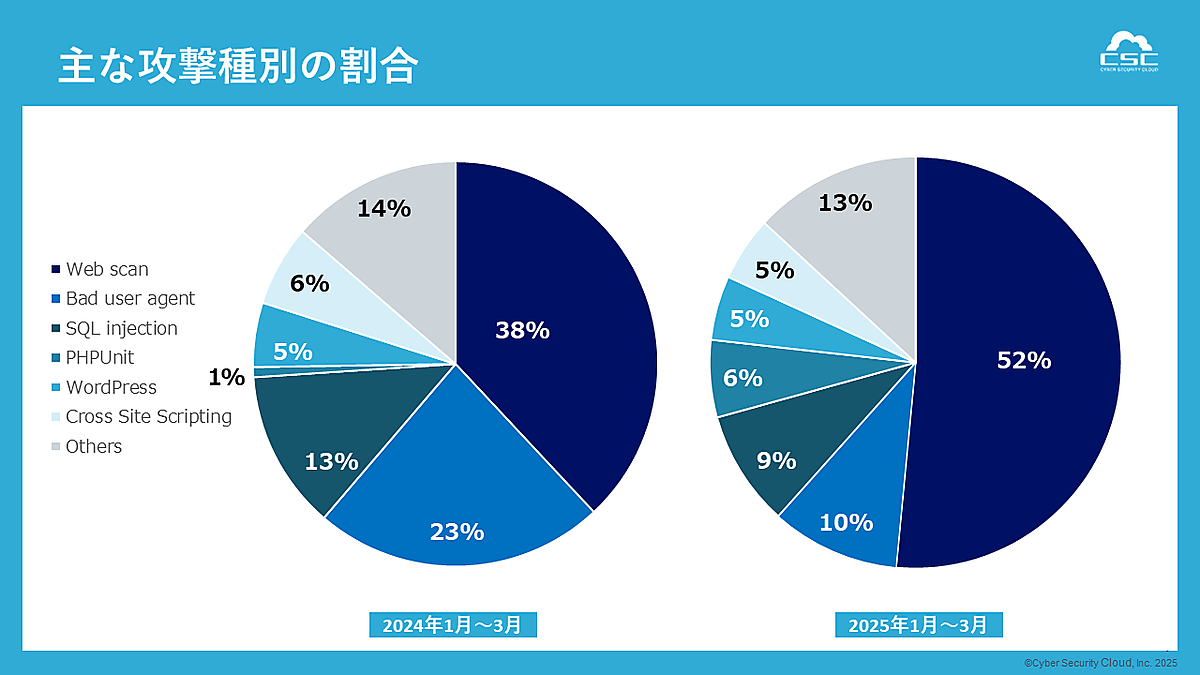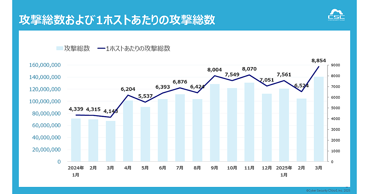 サイバーセキュリティクラウドは、2025年第1四半期(2025年1月1日~3月31日)を対象とした「Webアプリケーションを狙ったサイバー攻撃検知レポート」を発表した。同社のクラウド型WAF「攻撃遮断くん」、およびパブリッククラウドWAFの自動運用サービス「WafCharm」で観測したサイバー攻撃ログを集約し、分析・算出している。