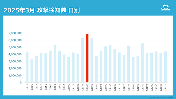 調査期間中、もっとも攻撃件数が多かった日は2025年3月14日で、検知件数は692万2,969件にのぼった(1秒あたり約80回)。前年1Qの1日平均攻撃件数は約229万8,029件だったため、約3倍に相当することとなる。