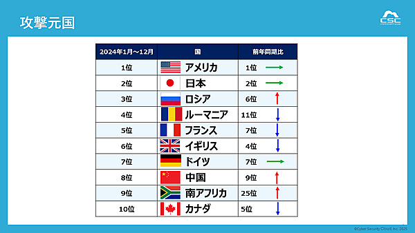 2025年Q1の攻撃元国ランキングでは、例年どおりアメリカ・日本・ロシアが上位を占めた一方で、前年同期では25位だった「南アフリカ」が9位に急浮上した。ルーマニアも11位から4位にランクアップしており、これまでとは異なる地域が目立った。
