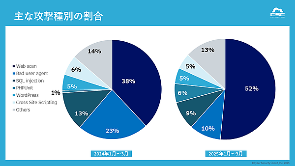 攻撃種別の状況では、全体傾向は変わらないものの、対象の探索・調査などの“攻撃準備”である「Web scan」が52%まで増大した。