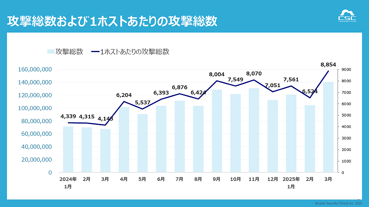 2025年第1四半期(2025年1月1日~3月31日)に検知された総攻撃数は3億6,595万6,552件、1ホストあたりでは47,884件だった。2月には、IoTボットネット「Eleven11bot」を使ったDDoS攻撃が国内外で報告されるなど、ボットネットを利用した大規模攻撃が目立ったという。
