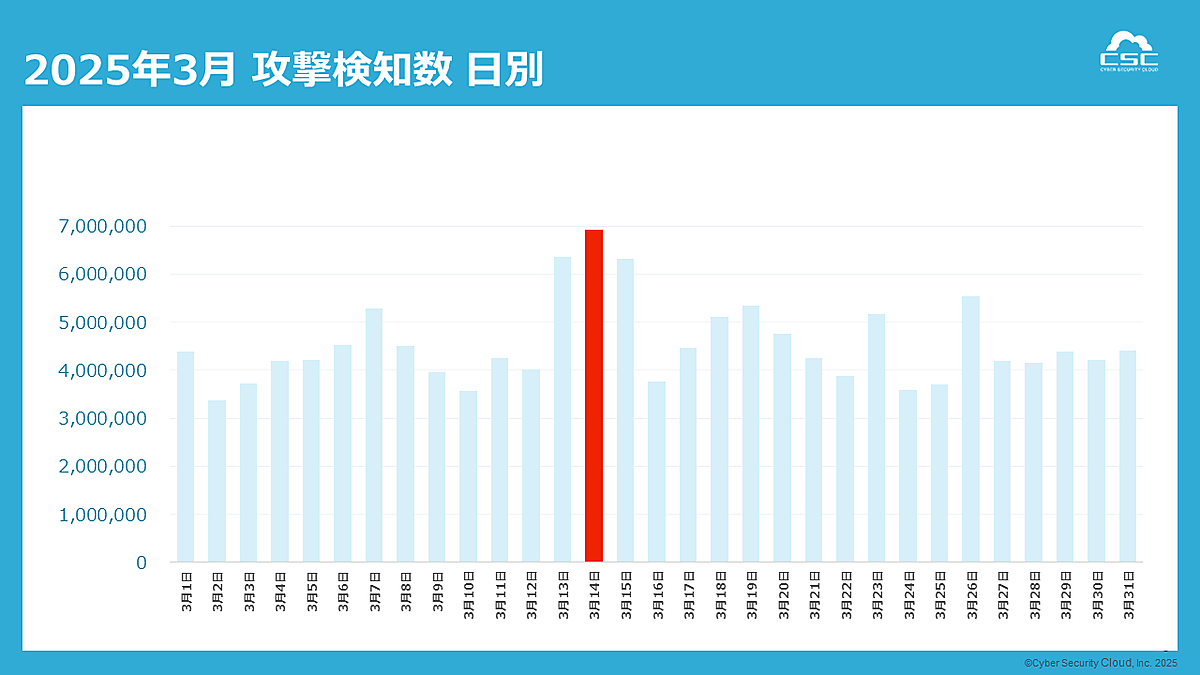 3月10日に、Webサーバ「Apache Tomcat」の新たな深刻なリモートコード実行脆弱性「CVE-2025-24813」が公表され、3月12日にポーランドからこの脆弱性を悪用した初期攻撃が確認された。その後、攻撃は世界中に急速に拡散。3月14日には利用者が多いGitHub Actions「changed-files」がサイバー攻撃の被害を受けて一時的に乗っ取られるサプライチェーン攻撃が発生した。ホワイトデーとも重なったことで、特に攻撃件数が集中したと推察される。