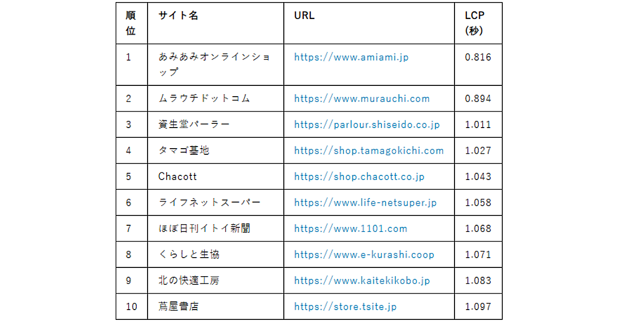 トップ10のサイト全てがLCP1.1秒以下を達成したのに加え、調査対象である275サイトのうち、73.6%がLCP2.5秒以内を達成。なお、7位の「ほぼ日刊イトイ新聞」はLCP1.228秒から1.068秒へ、10位の「蔦屋書店」は1.275秒から1.097秒への短縮に成功した。