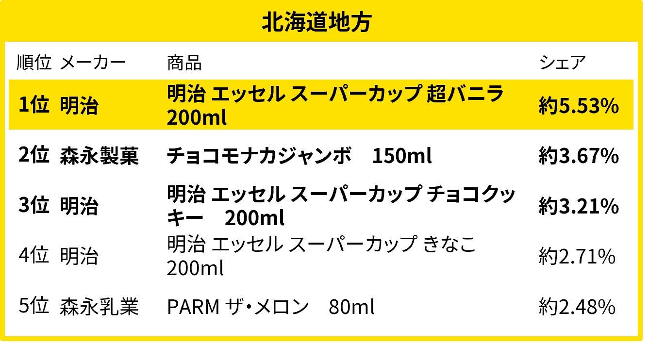 北海道地方の1位は「明治 エッセル スーパーカップ 超バニラ(明治)」で、シェアは5%を超えて圧倒的な人気に。2位は「チョコモナカジャンボ(森永製菓)」、3位は「明治 エッセル スーパーカップ チョコクッキー(明治)」だった。