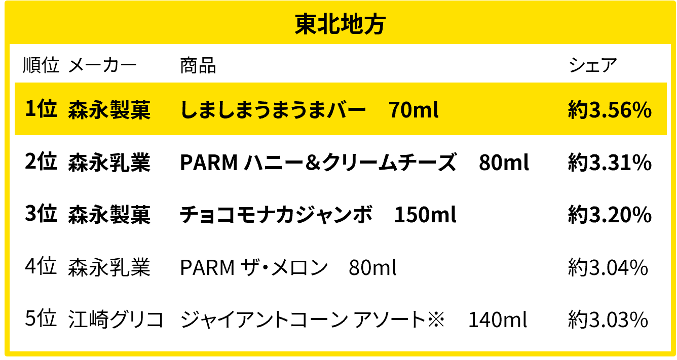 東北地方の1位は「しましまうまうまバー(森永製菓)」、2位は「PARM ハニー&クリームチーズ(森永乳業)」、3位は「チョコモナカジャンボ(森永製菓)」だった。