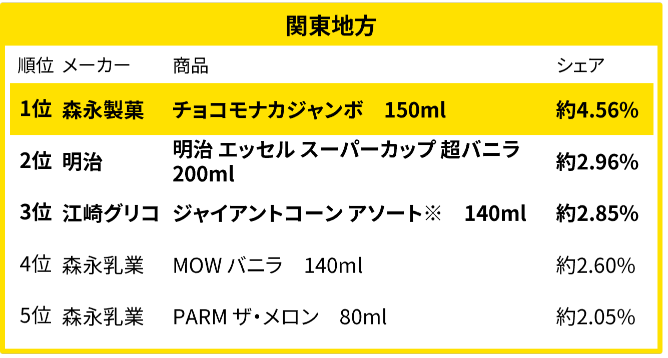関東地方の1位は「チョコモナカジャンボ(森永製菓)」、2位は「明治 エッセル スーパーカップ 超バニラ(明治)」、3位は「ジャイアントコーン アソート(江崎グリコ)」となった。