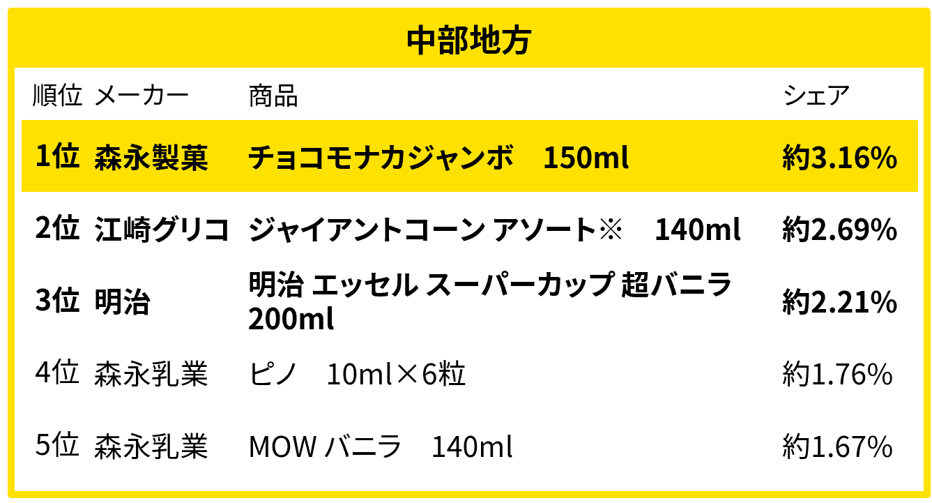 中部地方の1位は「チョコモナカジャンボ(森永製菓)」、2位は「ジャイアントコーン アソート(江崎グリコ)」、3位は「明治 エッセル スーパーカップ 超バニラ(明治)」となった。
