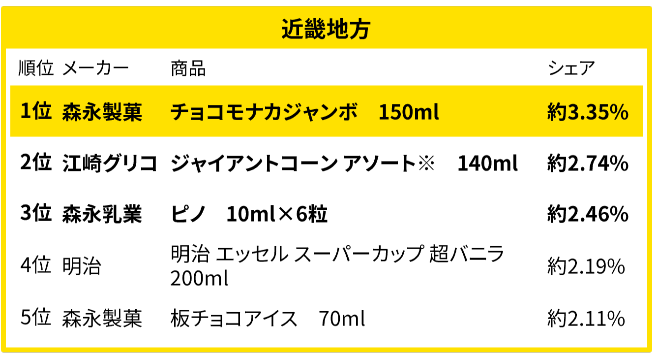 近畿地方の1位は「チョコモナカジャンボ(森永製菓)」、2位は「ジャイアントコーン アソート(江崎グリコ)」、3位は「ピノ(森永乳業)」となった。