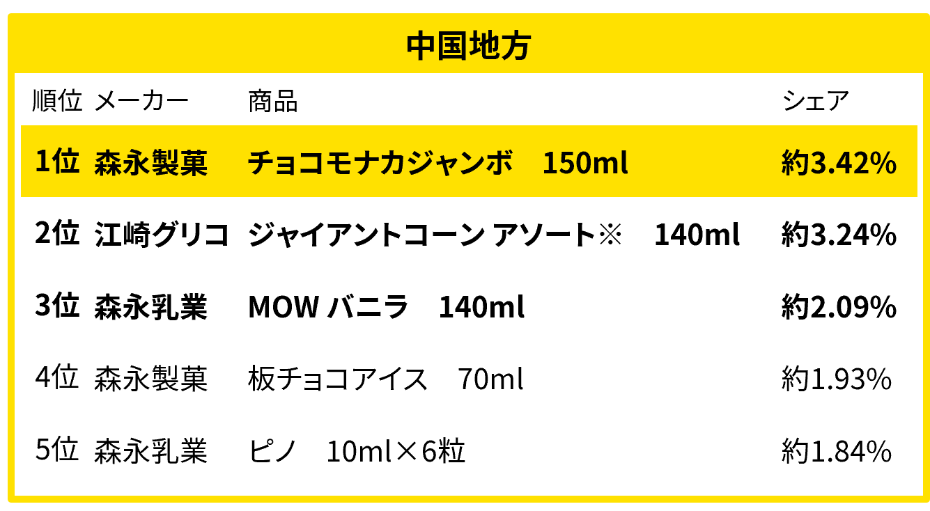 中国地方の1位は「チョコモナカジャンボ(森永製菓)」、2位は「ジャイアントコーン アソート(江崎グリコ)」、3位は「MOW バニラ(森永乳業)」となった。