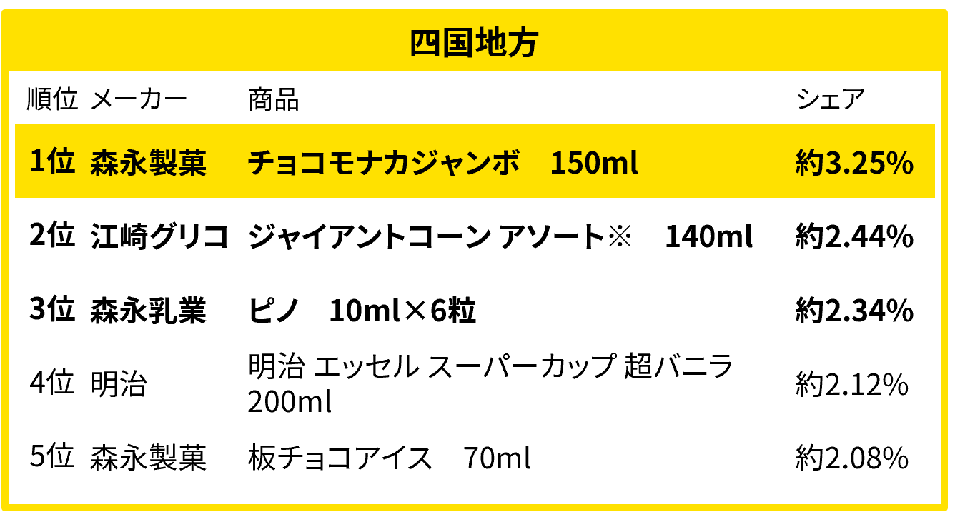 四国地方の1位は「チョコモナカジャンボ(森永製菓)」、2位は「ジャイアントコーン アソート(江崎グリコ)」、3位は「ピノ(森永乳業)」で、トップ5は近畿地方と同じだった。