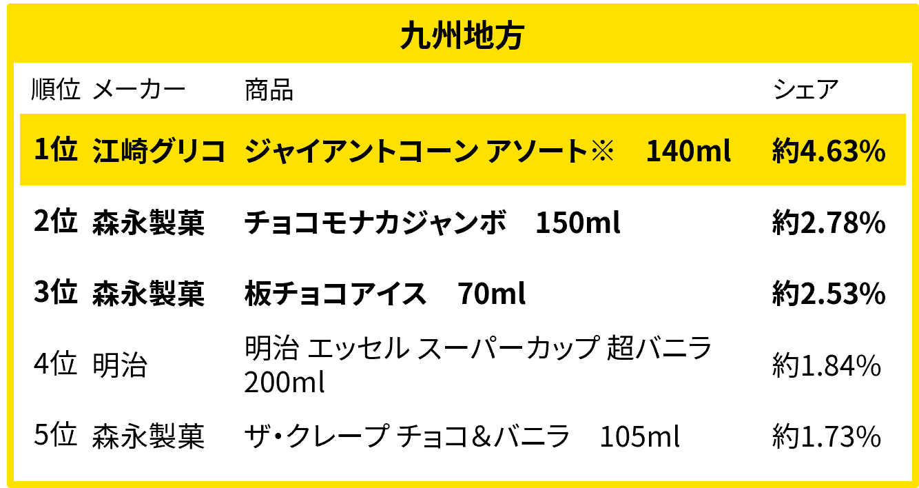 九州地方の1位は「ジャイアントコーン アソート(江崎グリコ)」、2位は「チョコモナカジャンボ(森永製菓)」、3位は「板チョコアイス(森永製菓)」となった。