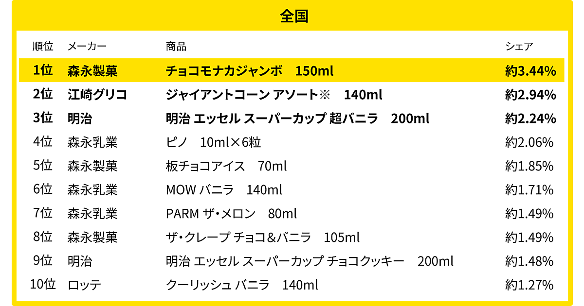 全国ランキングの1位は「チョコモナカジャンボ(森永製菓)」。2位は「ジャイアントコーン アソート(江崎グリコ)」、3位は「明治 エッセル スーパーカップ 超バニラ(明治)」と続いた。アイスは乳成分の量によって「アイスクリーム」「アイスミルク」「ラクトアイス」「氷菓」の4種類に分けられるが、乳成分が多いアイスクリーム、アイスミルクが大半を占める結果となり、氷菓はランクインしなかった。