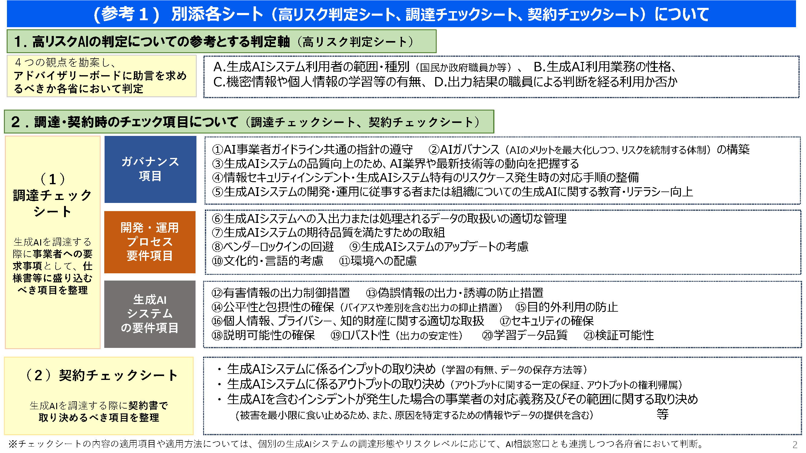 調達チェックシートはガバナンス、開発・運用プロセス要件、生成AIシステム要件--の各項目があり、契約チェックシートは生成AIの調達時に契約書で取り決める項目を整理している。提供者と利用者は、リスクのあるケースが生じた際にはCAIOに適切に報告し、提供者が対応を実施。同アドバイザリーボードが必要に応じて再発防止策を検討する。