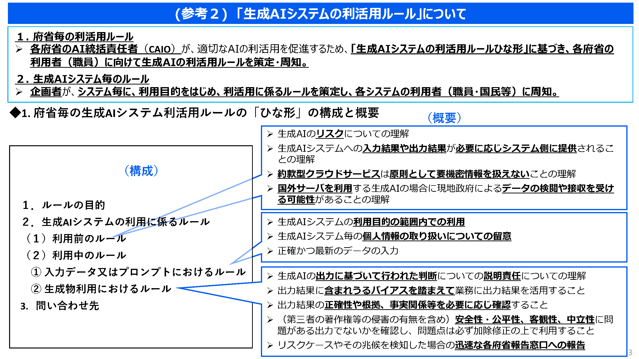 政府でのAIの推進・ガバナンス・調達・利活用のあり方を定めた。テキスト生成AIを構成要素にするシステムを対象に5月に運用を始める。高リスクの可能性がある生成AIでも、有識者らで構成する「先進的AI利活用アドバイザリーボード」の助言やデジタル庁の相談窓口を通じ、安全で効果的なAIプロジェクトとして実施を支援し、利活用を推進する。