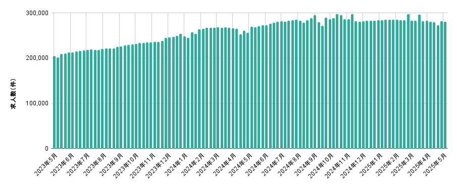 2025年5月度の「正社員」の平均月給は286,910円で、前月比+525円、前年同月比+4,768円の増加となった。求⼈数は280,724件(前⽉⽐+698件、前年同⽉⽐+11,443件)で、前年同月から4.25%増加した。