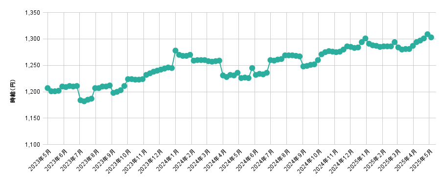 2025年5月度の「アルバイト・パート」の平均時給は1,303円で、前月比+9円、前年同月比+77円の増加。求⼈数は602,783件で、前⽉⽐では-26,949件の減少、前年同⽉⽐では+120,023件の増加となった。