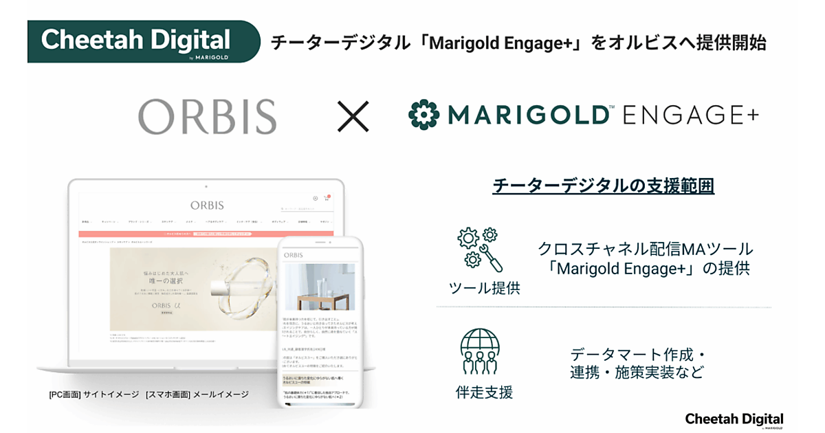 顧客エンゲージメント(関係・信頼性)ソリューション事業の米国チーターデジタルの日本法人、チーターデジタルは、化粧品販売のオルビスに、MA(マーケティングオートメーション)ツール「Marigold Engage+(マリゴールドエンゲージプラス」の提供を始めた、と5月28日発表した。オルビスは顧客それぞれに合わせたOne to Oneコミュニケーション施策実現を目指す。