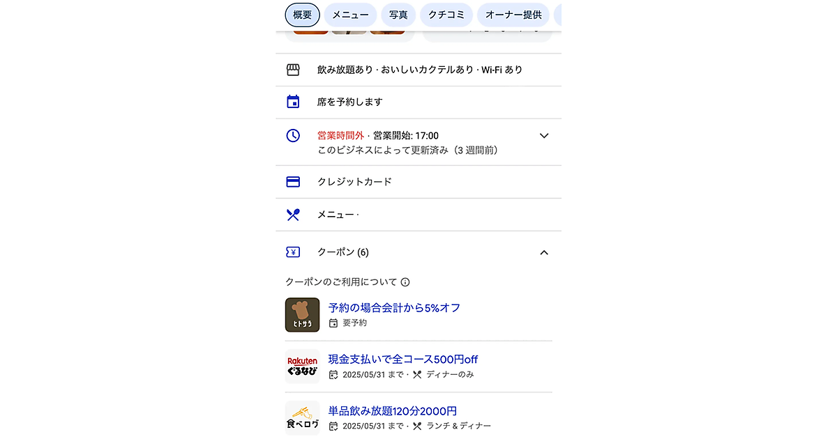 Googleは、 「Google検索」「Googleマップ」に表示されるビジネス情報をオーナーが登録・管理できるツール「Googleビジネスプロフィール」の新機能を5月28日発表した。スマートフォンで飲食店に関してGoogle検索した際、検索結果のビジネスプロフィール上に店舗の基本情報ととともに、店で使えるクーポン情報が同日から表示されるようになった。