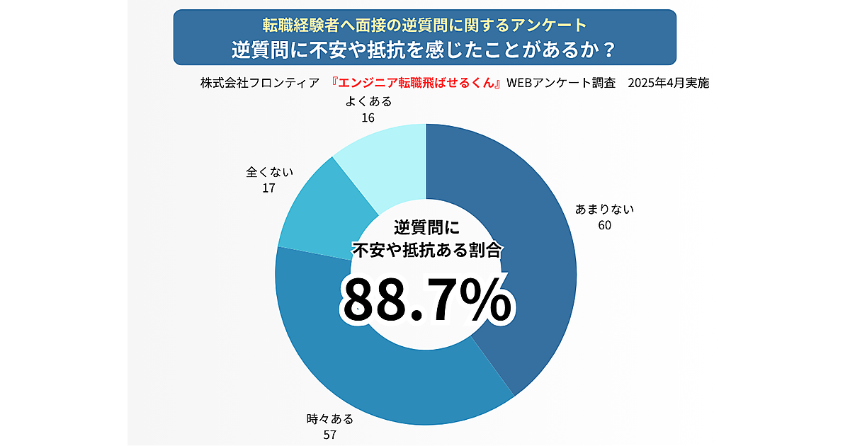 フロンティアが運営する転職支援サービス「エンジニア転職 面接飛ばせる君」は、「面接時の逆質問」に関する調査結果を発表した。面接で「逆質問が苦手」と感じたことがある転職経験者150人が回答している。