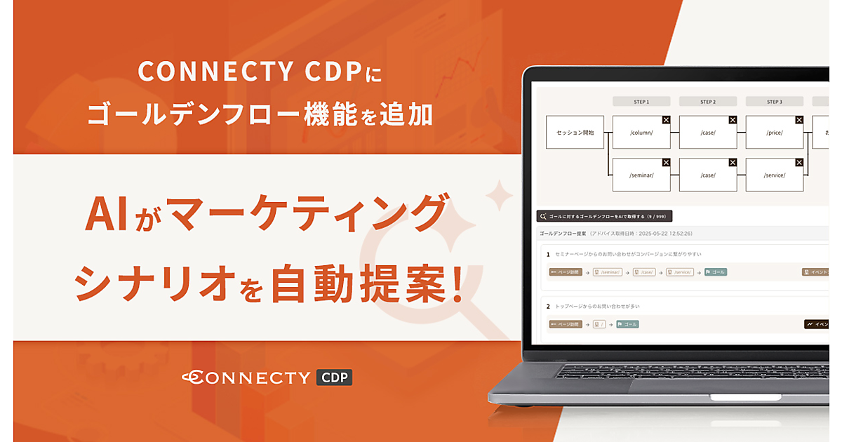CDPやMA(マーケティングオートメーション)ツールを導入した企業の「設計・設定が複雑で使いこなせない」「施策実行までに時間がかかる」という課題に対応。専門知識がなくても施策の立ち上げを可能にした。CONNECTY CDPに蓄積されたアクセスデータをAIが分析し、会員登録、資料請求など設定ゴールに向けた最適なシナリオフロー“ゴールデンフロー”を提案する。