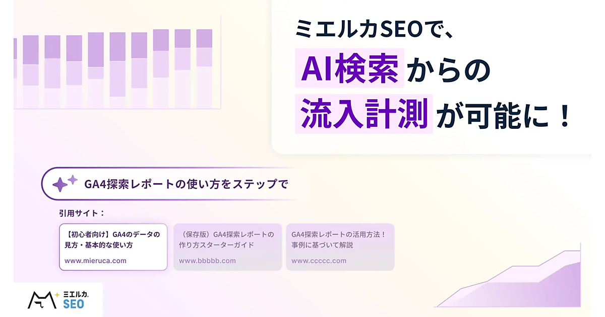 ミエルカSEOの「サイトレポートサマリー」内に「AI Search(AI検索)」という名の流入元カテゴリを追加した。自然検索、広告など他の流入経路と同じように「ChatGPT」「Gemini」「Perplexity」をはじめとするAIツールからの流入をまとめて表示。AI検索からの流入数を自動的に集計し、他の流入チャネルと比較したAI検索の割合や流入の推移を可視化する。