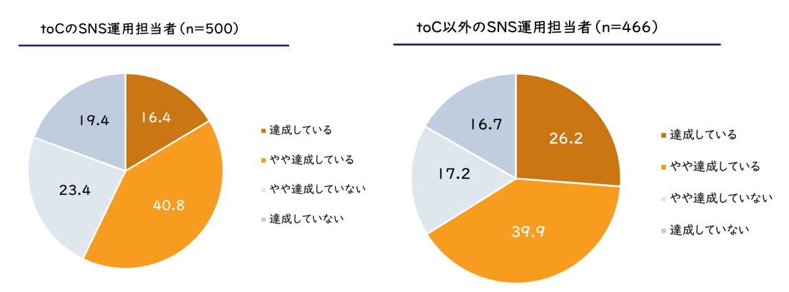 「SNS運用のKPIは達成できているか」について聞くと、「toC」「toC以外」どちらも「達成している」「やや達成している」の合算で過半数を占める。ただし「達成している」に限ると、「toC以外」が26.2%であるのに対し、「toC」は16.4%にとどまる。これは「toC」領域では企業アカウントも、一般ユーザーやインフルエンサーと同じようにエンタメ性・話題性・即時性が求められるため、KPI達成のハードルが相対的に高くなっていると推察される。