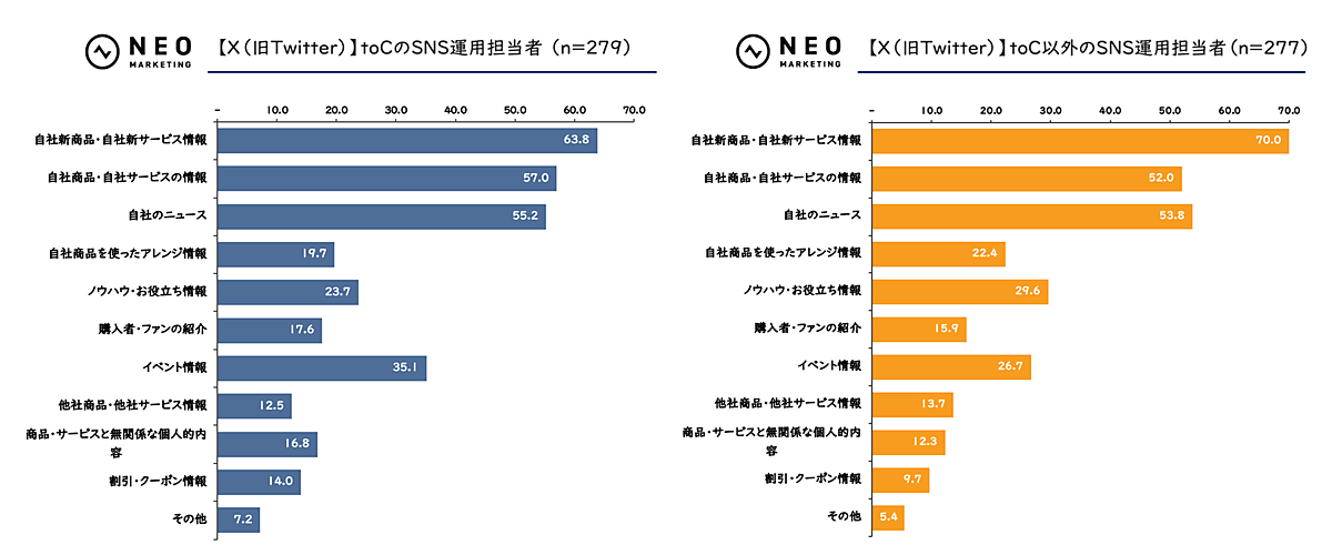 次に、もっとも利用率が高かった「X」と利用率が大きく増えた「TikTok」「YouTube」について、「SNSの投稿内容」を聞くと、「X」の場合は「toC」「toC以外」いずれも「自社新商品・自社新サービス情報」が最多。「自社商品・自社サービスの情報」「自社のニュース」がそれに続く。