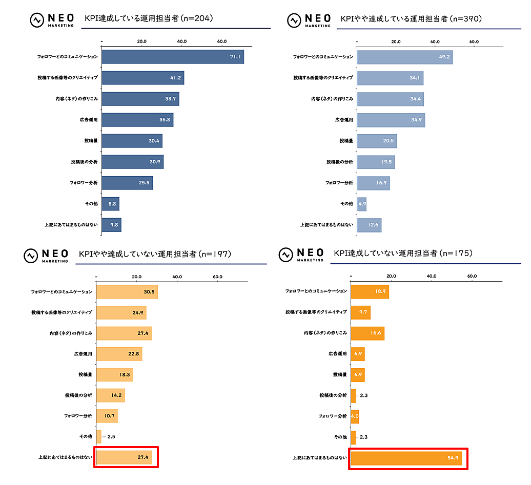 そして「SNS運用について、力を入れていること」を聞くと、KPI達成度が高い運用担当者ほど「クリエイティブ」や「投稿の作り込み」よりも、「フォロワーとのコミュニケーション」を重視していることが判明した。KPI達成している運用担当者においては「クリエイティブ」41.2%や「内容(ネタ)の作り込み」38.7%への注力も高いが、「フォロワーとのコミュニケーション」71.1%を挙げており、他のすべての項目を大きく上回る。